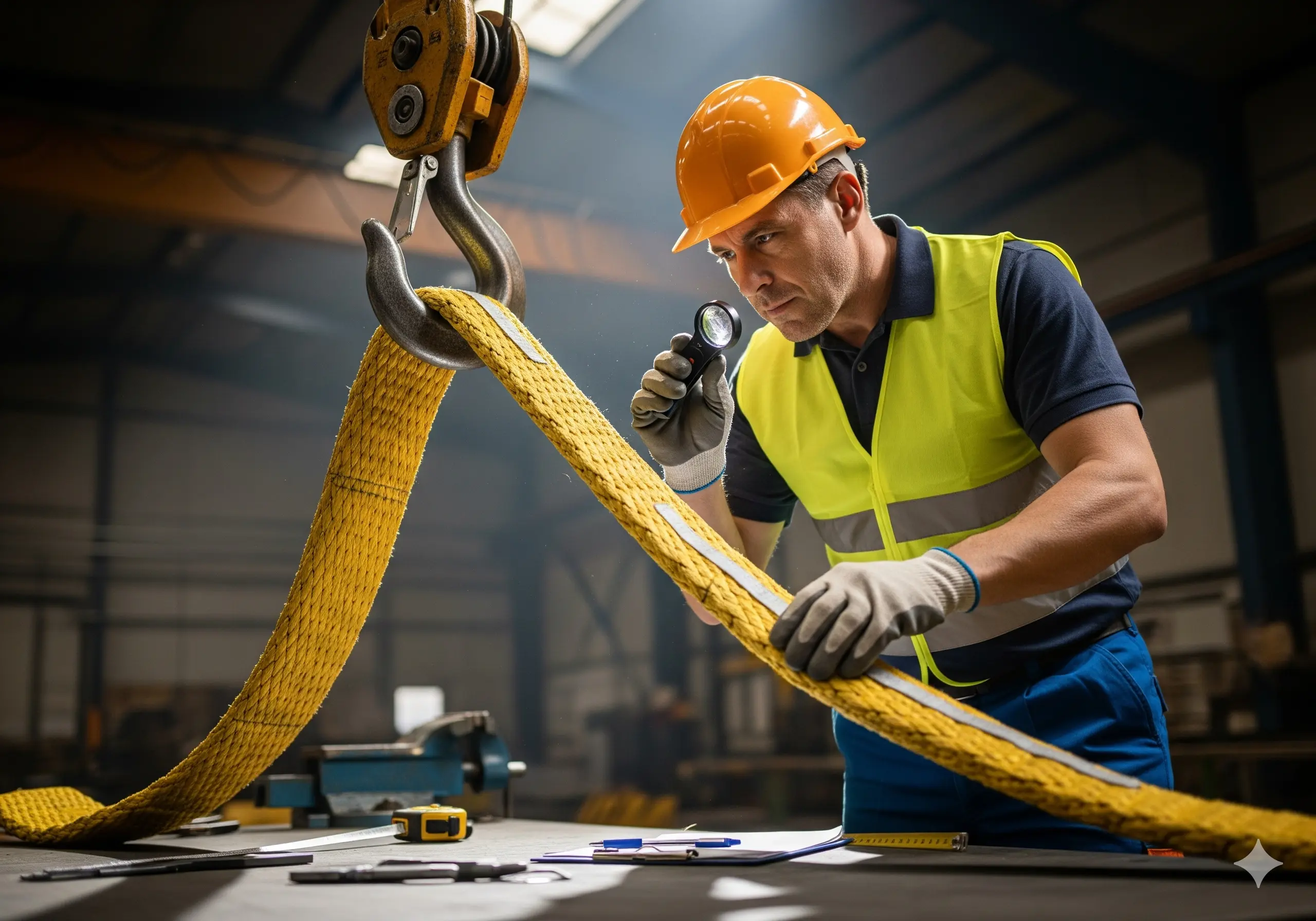 - Eslingas sintéticas (webbing/round). Corta, quemaduras, abrasión, decoloración UV, costuras flojas o etiquetas perdidas son criterios de retiro inmediato.